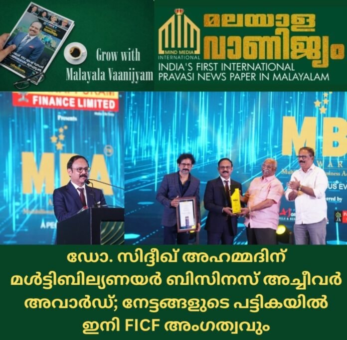ഡോ. സിദ്ദീഖ് അഹമ്മദിന് മൾട്ടിബില്യണയർ ബിസിനസ് അച്ചീവർ(MBA) അവാർഡ്; നേട്ടങ്ങളുടെ പട്ടികയിൽ ഇനി FICF അംഗത്വവും