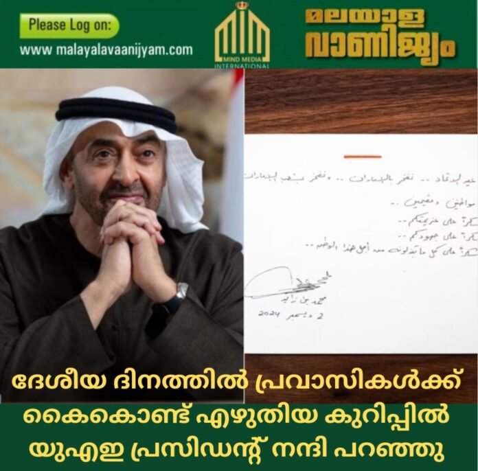 അബുദാബി :-ദേശീയ ദിനത്തോടനുബന്ധിച്ച് യുഎഇ പ്രസിഡൻ്റ് ഷെയ്ഖ് മുഹമ്മദ് തിങ്കളാഴ്ച രാജ്യത്തെ പ്രവാസികൾക്കും പൗരന്മാർക്കും ഹൃദയസ്പർശിയായ ഒരു സന്ദേശം അയച്ചു.എക്സിലെ ഒരു സന്ദേശത്തിൽ ഷെയ്ഖ് മുഹമ്മദ് പറഞ്ഞു:
