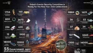 2026 ലെ പുതുവത്സരാഘോഷ ങ്ങൾക്കായുള്ള ദുബായിയുടെ വിപുലമായ സുരക്ഷയും പ്രവർത്തന തയ്യാറെടുപ്പുകളും ഇൻഫോഗ്രാഫിക് പ്രദർശിപ്പിച്ചി രിക്കുന്നു. സർക്കാർ, അർദ്ധ സർക്കാർ, സ്വകാര്യ സ്ഥാപനങ്ങൾ എന്നിവ ഉൾപ്പെടുന്ന ഒരു ഏകോപിത ശ്രമമാണ് പദ്ധതിയുടെ കേന്ദ്രബിന്ദു, നഗരത്തിലുടനീളം സുരക്ഷയും സുഗമമായ പ്രവർത്ത നങ്ങളും ഉറപ്പാക്കാൻ 55 സംഘട നകൾ സംഭാവന ചെയ്യുന്നു. മൊത്തം, 9,884 ദുബായ് പോലീസ് ഉദ്യോഗസ്ഥർ ഡ്യൂട്ടിയിലുണ്ടാകും, 1,625 സുരക്ഷാ പട്രോളിംഗുകൾ, 36 സൈക്കിൾ പട്രോളിംഗുകൾ, 53 സുരക്ഷാ, മറൈൻ റെസ്ക്യൂ ബോട്ടുകൾ, 34 മൗണ്ട് പട്രോളിം ഗുകൾ എന്നിവ ഇതിൽ ഉൾപ്പെ ടുന്നു. സിവിൽ ഡിഫൻസ് 165 വാഹനങ്ങൾ ഉൾപ്പെടെ 1,754 ഉദ്യോഗസ്ഥരെ വിന്യസിക്കും, ദുബായ് മുനിസിപ്പാലിറ്റി 800 DEWA ഉദ്യോഗസ്ഥരുടെ പിന്തുണയോടെ 2,675 ജീവനക്കാരെ സംഭാവന ചെയ്യും. മെഡിക്കൽ സന്നദ്ധത വിപുലമാണ്, 12 ആശുപത്രികളും ഫീൽഡ് ക്ലിനിക്കുകളും, 1,900 മെഡിക്കൽ സ്റ്റാഫുകളും, 236 ആംബുലൻസുകളും, 635 ആംബുലൻസ് ജീവനക്കാരും അടിയന്തര സാഹചര്യങ്ങൾക്കായി തയ്യാറാണ്.