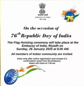റിയാദ് ഇന്ത്യൻ എംബസി റിപ്പബ്ലിക് ദിനാഘോഷം; രജിസ്ട്രേഷൻ ക്ഷണിച്ചു